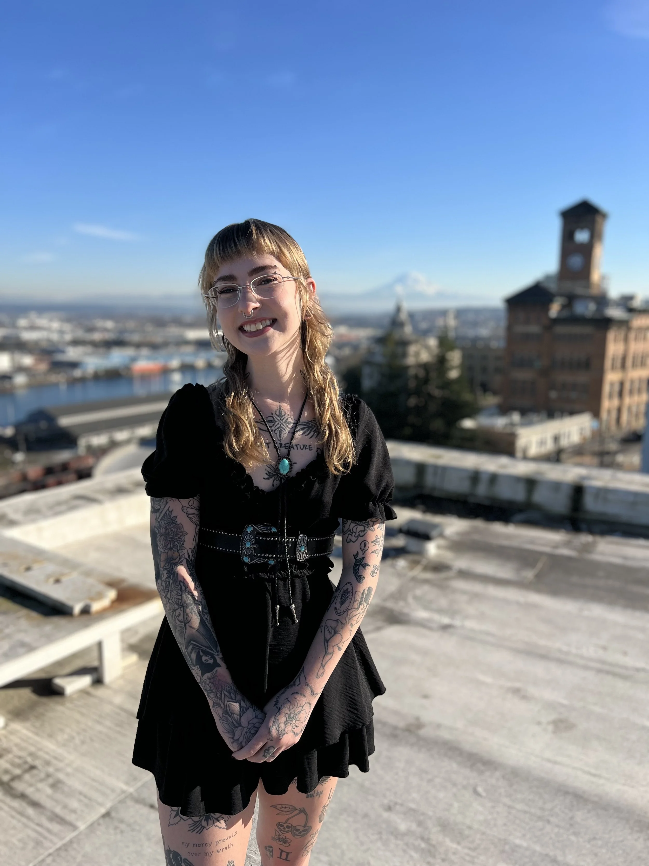 Madi creates bold, ornamental tattoos with a feminine edge, inspired by strong women in her life and pop culture. Her work blends whimsical and macabre imagery, rooted in a lifelong love of creating across all mediums. Tattooing since 2021, she began her journey in Nebraska and approaches every session with the goal of making it feel like catching up with an old friend only permanent.